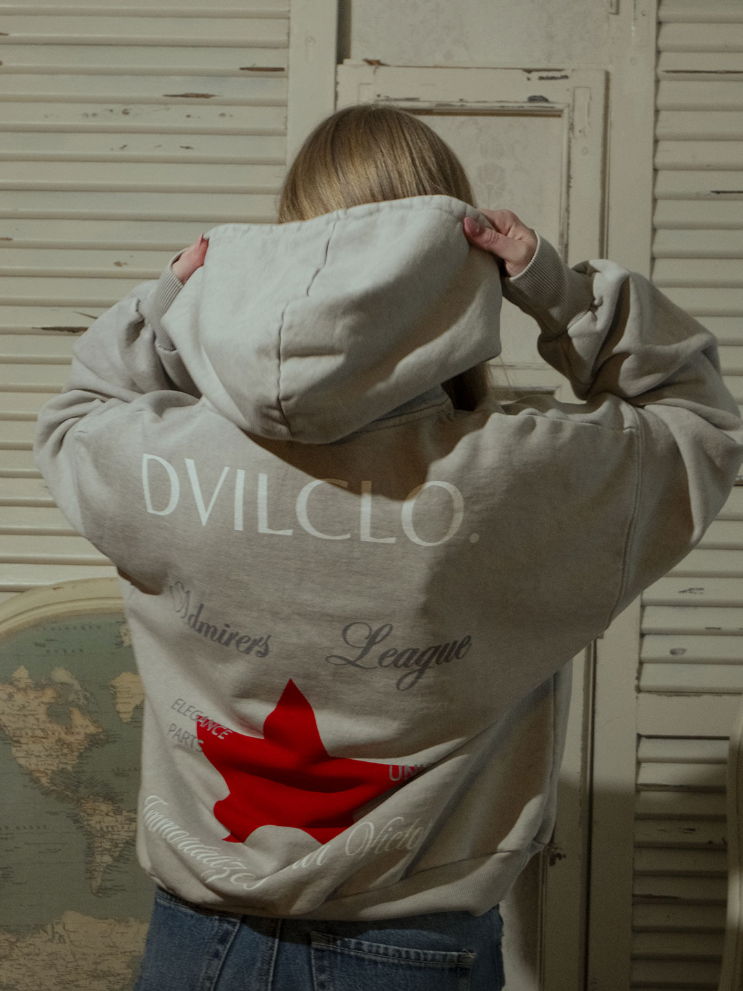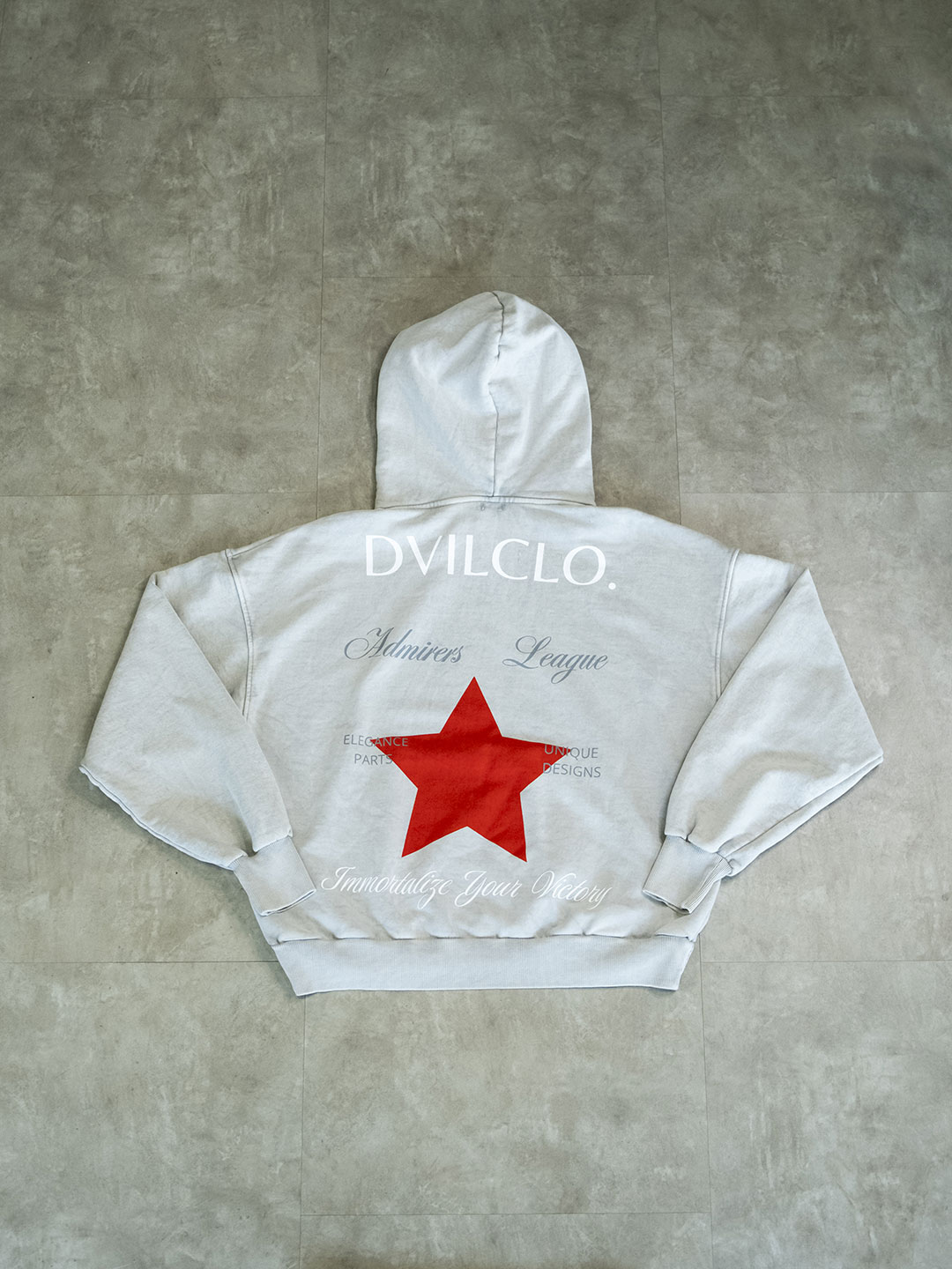 Sudadera de diseño tinte en prenda gris claro con estampado frontal discreto en el pecho izquierdo Dvilclo superstar en blanco y rojo , y estampado de diseño admirers league x superstar en la espalda a tonos blanco, gris oscuro y rojo.