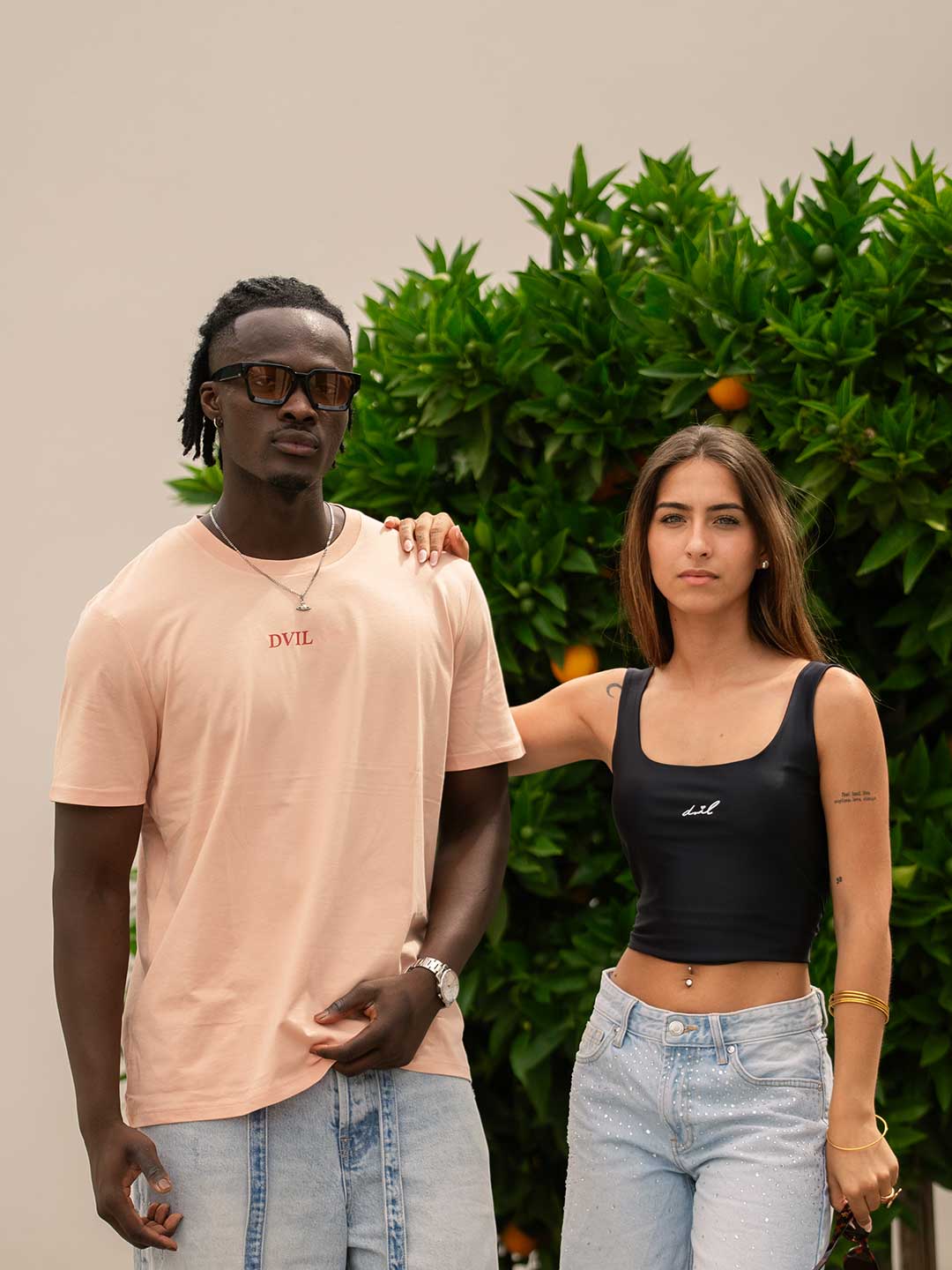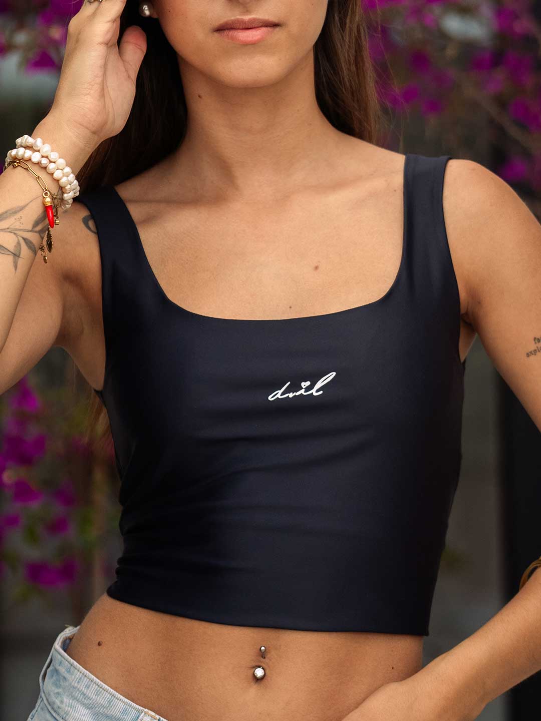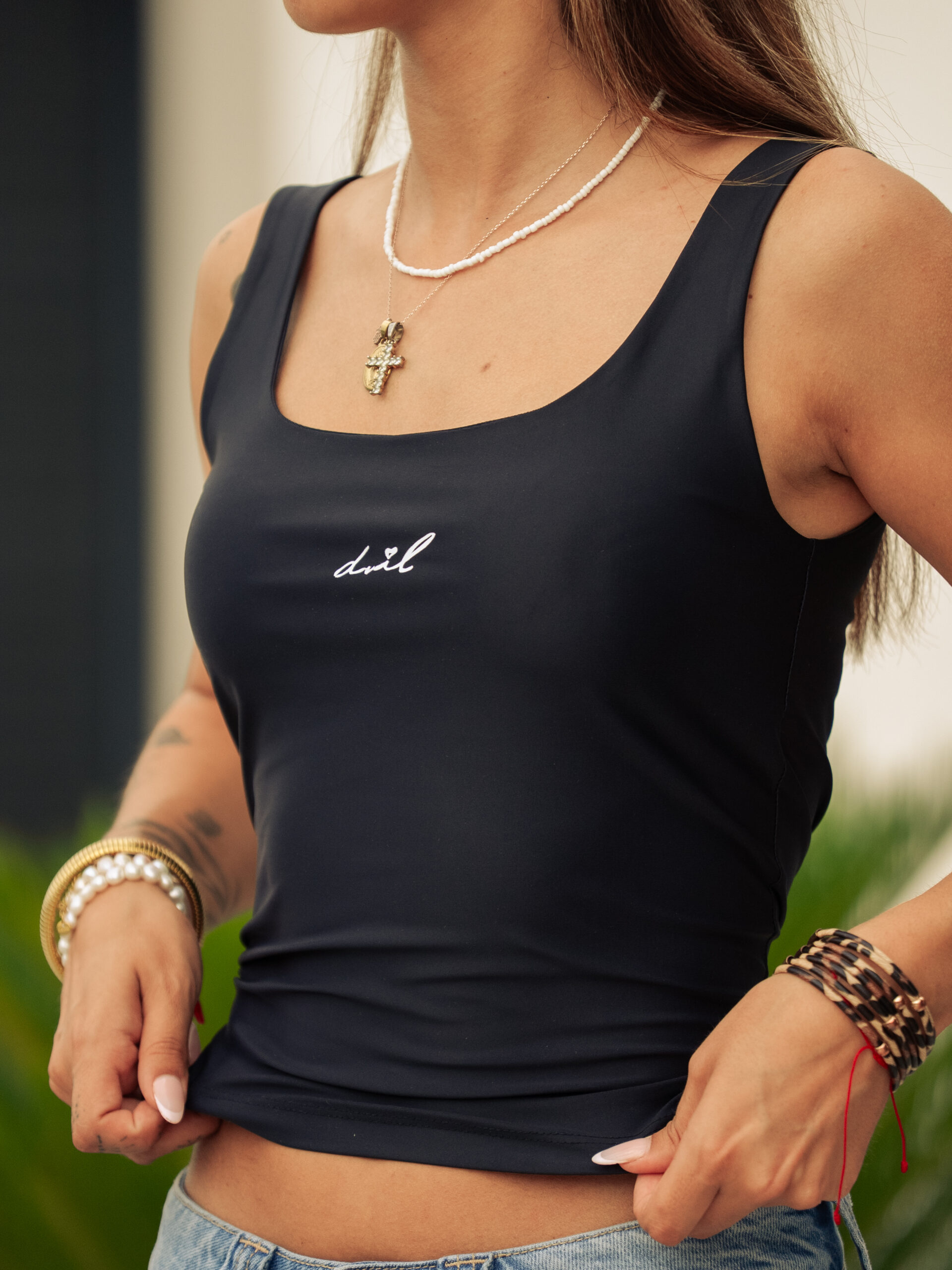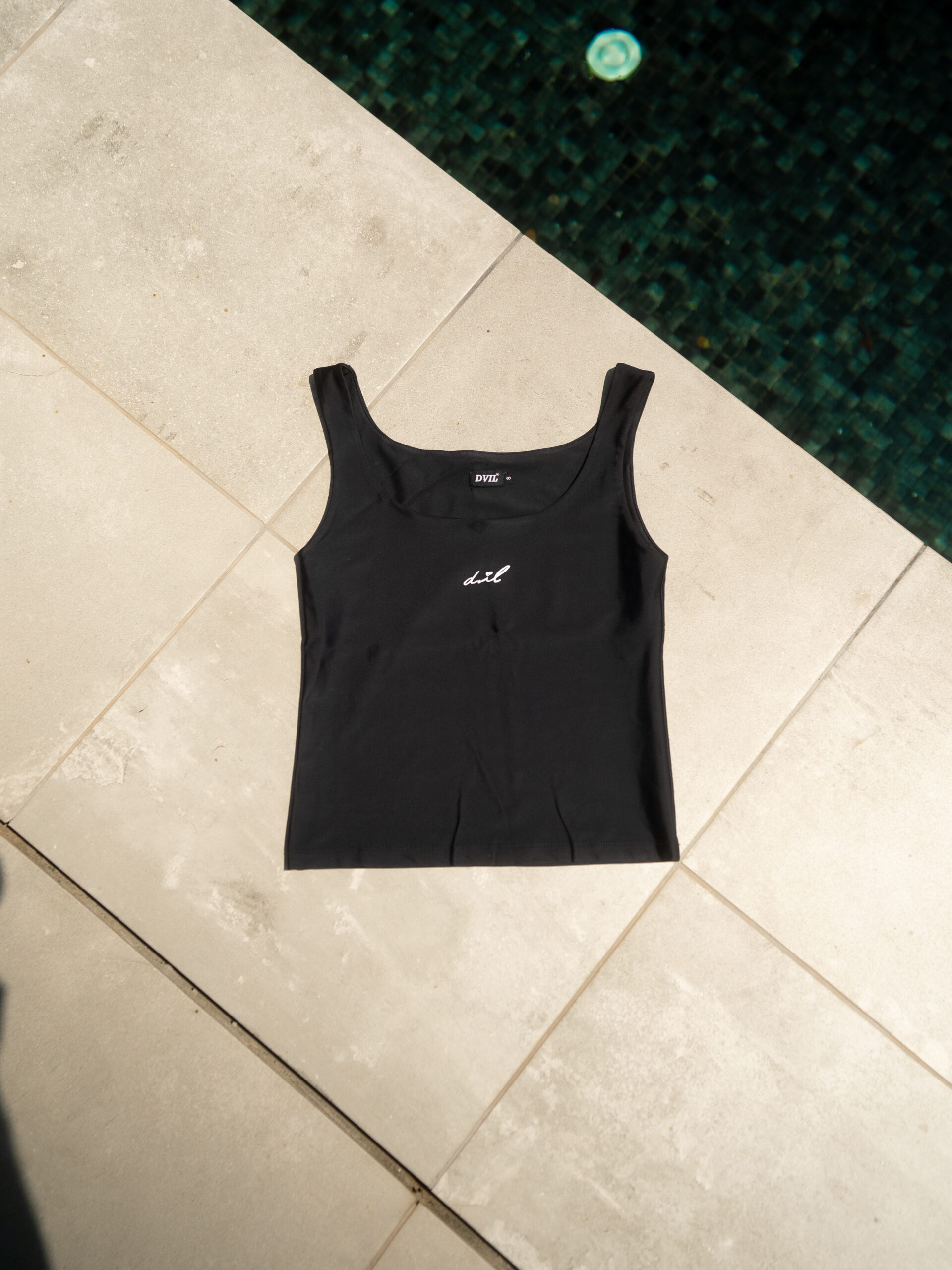Camiseta top negra con el detalle DVIL en blanco. Cómoda y acogedora.