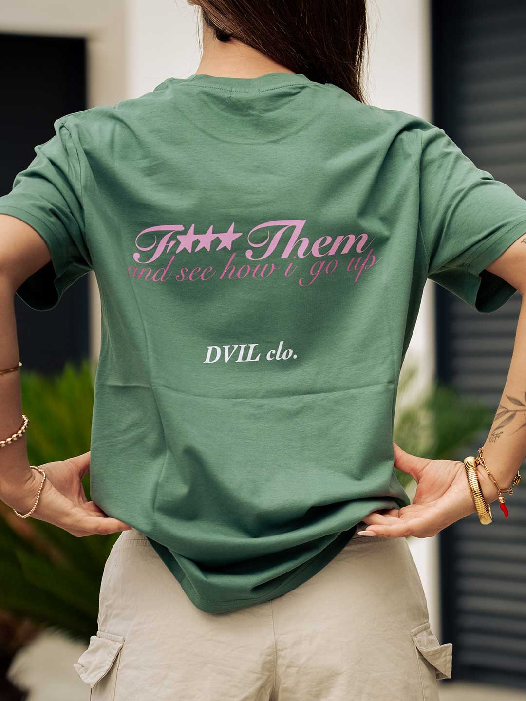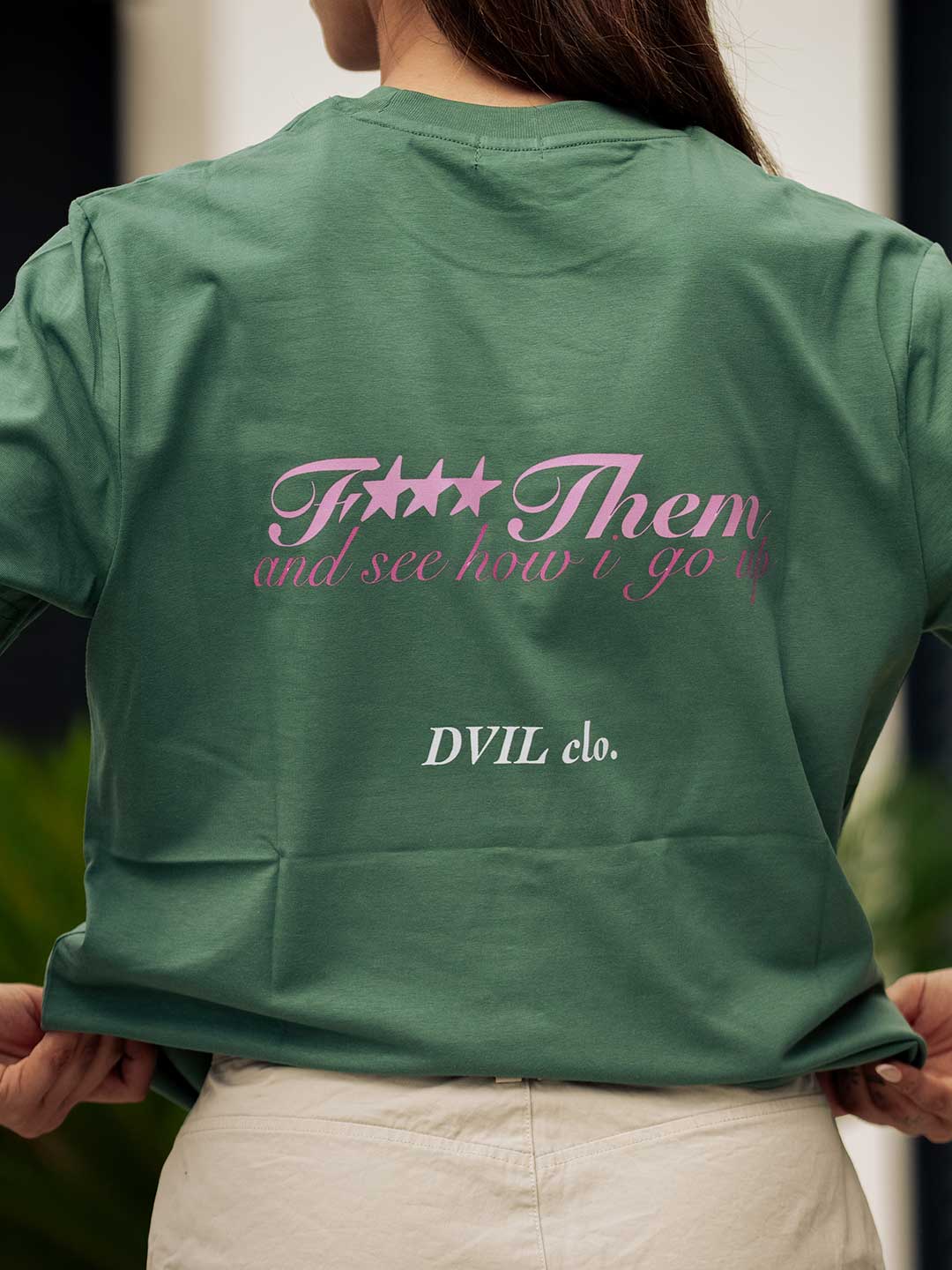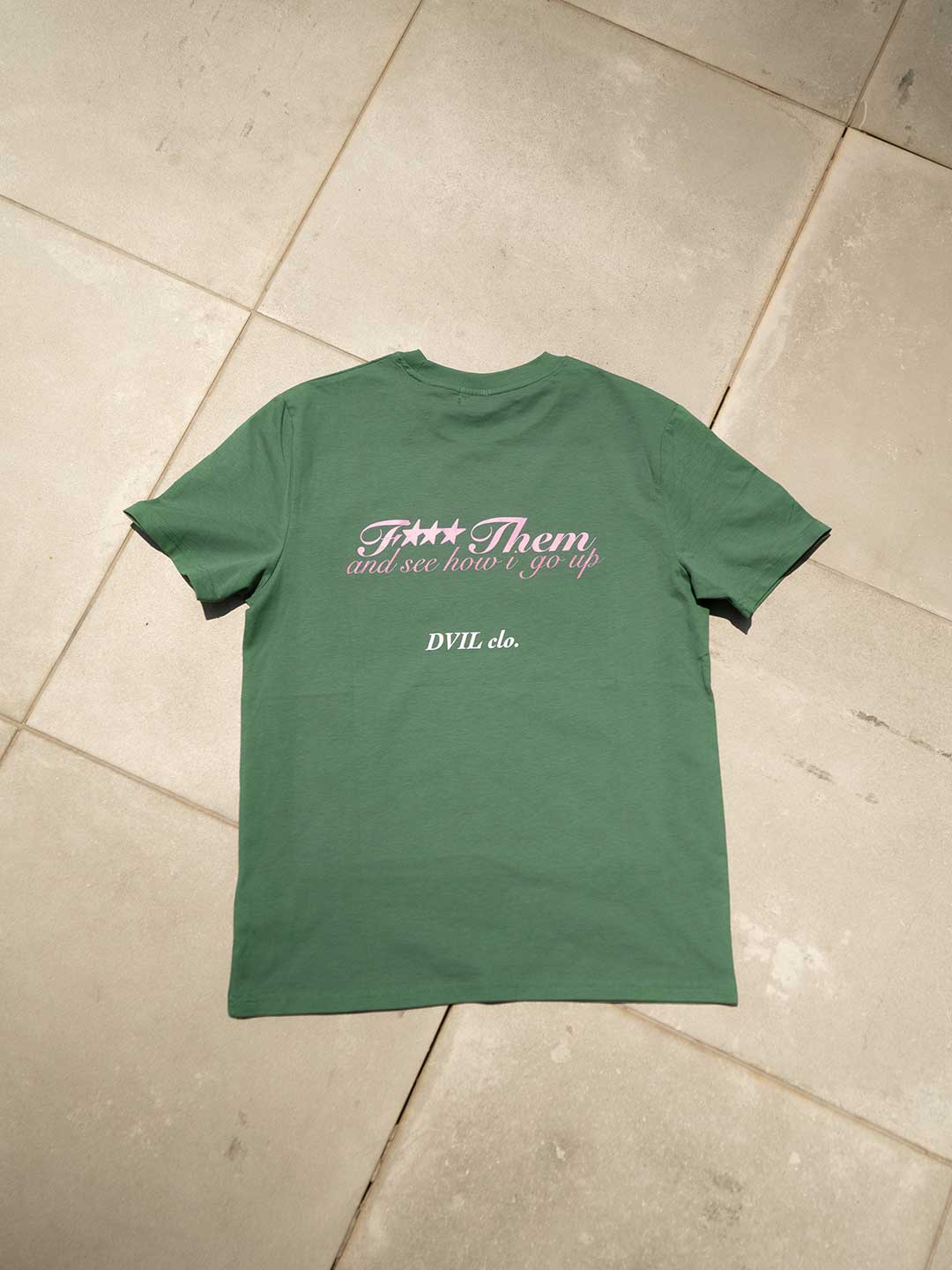 Camiseta F*** THEM verde oliva con detalles rosa y blanco que marcan la diferencia y estilo.