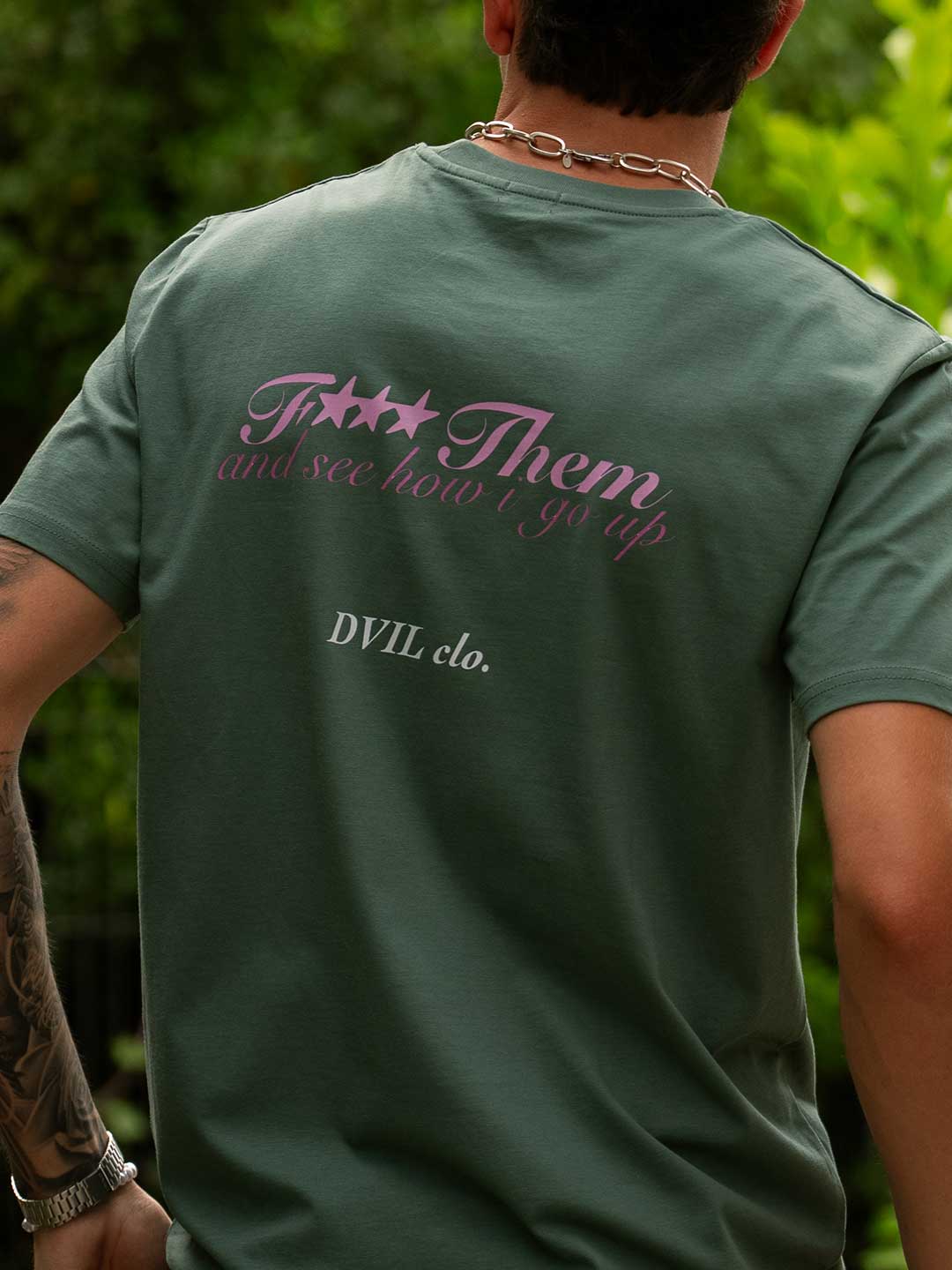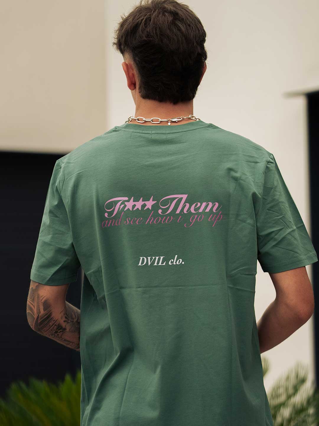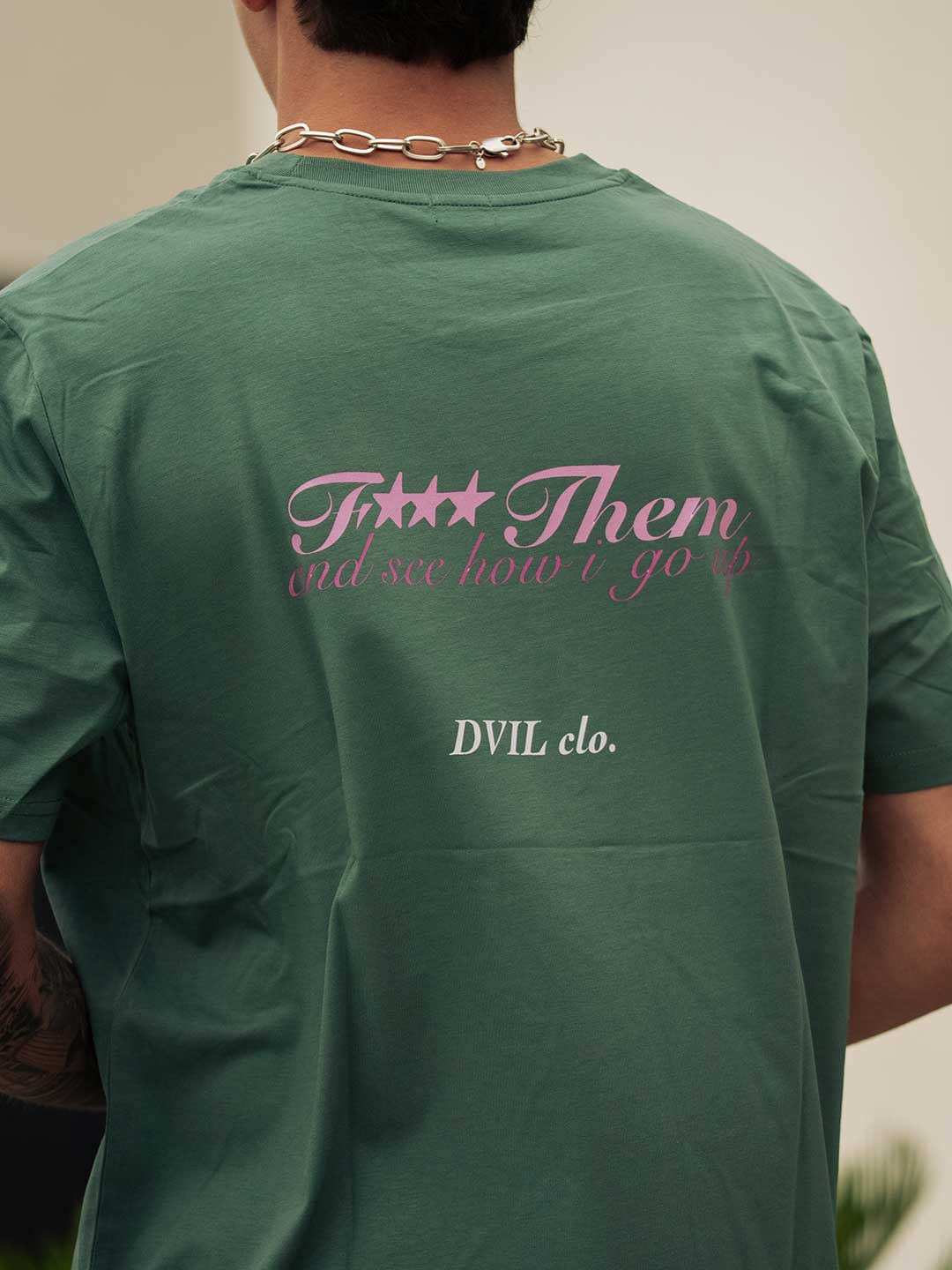 Camiseta F*** THEM verde oliva con detalles rosa y blanco que marcan la diferencia y estilo.