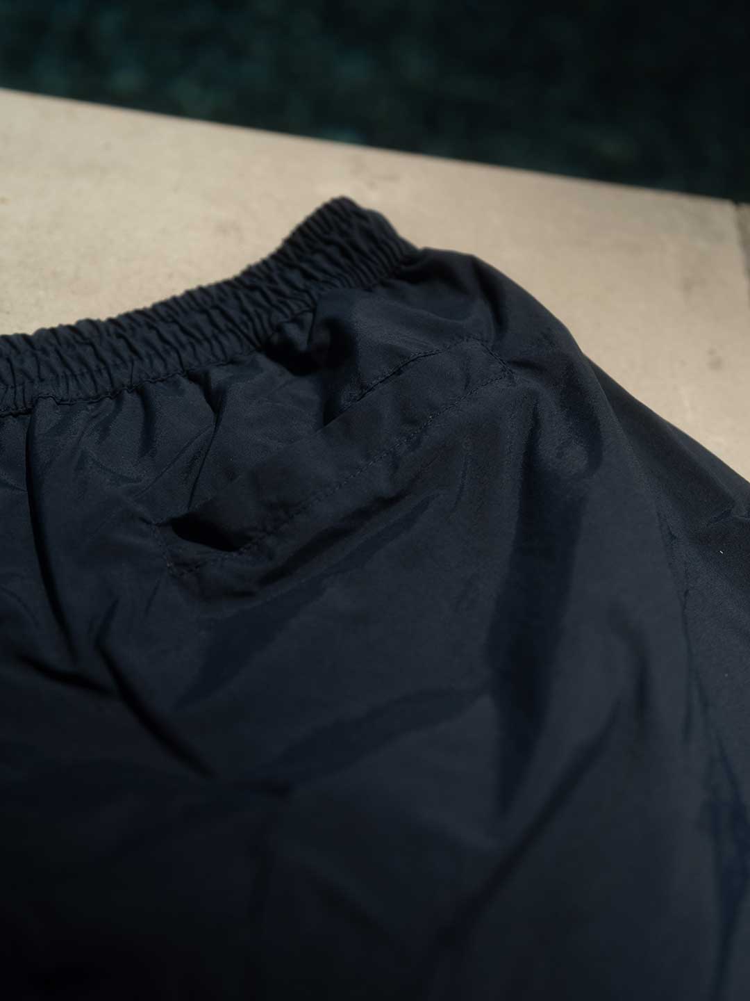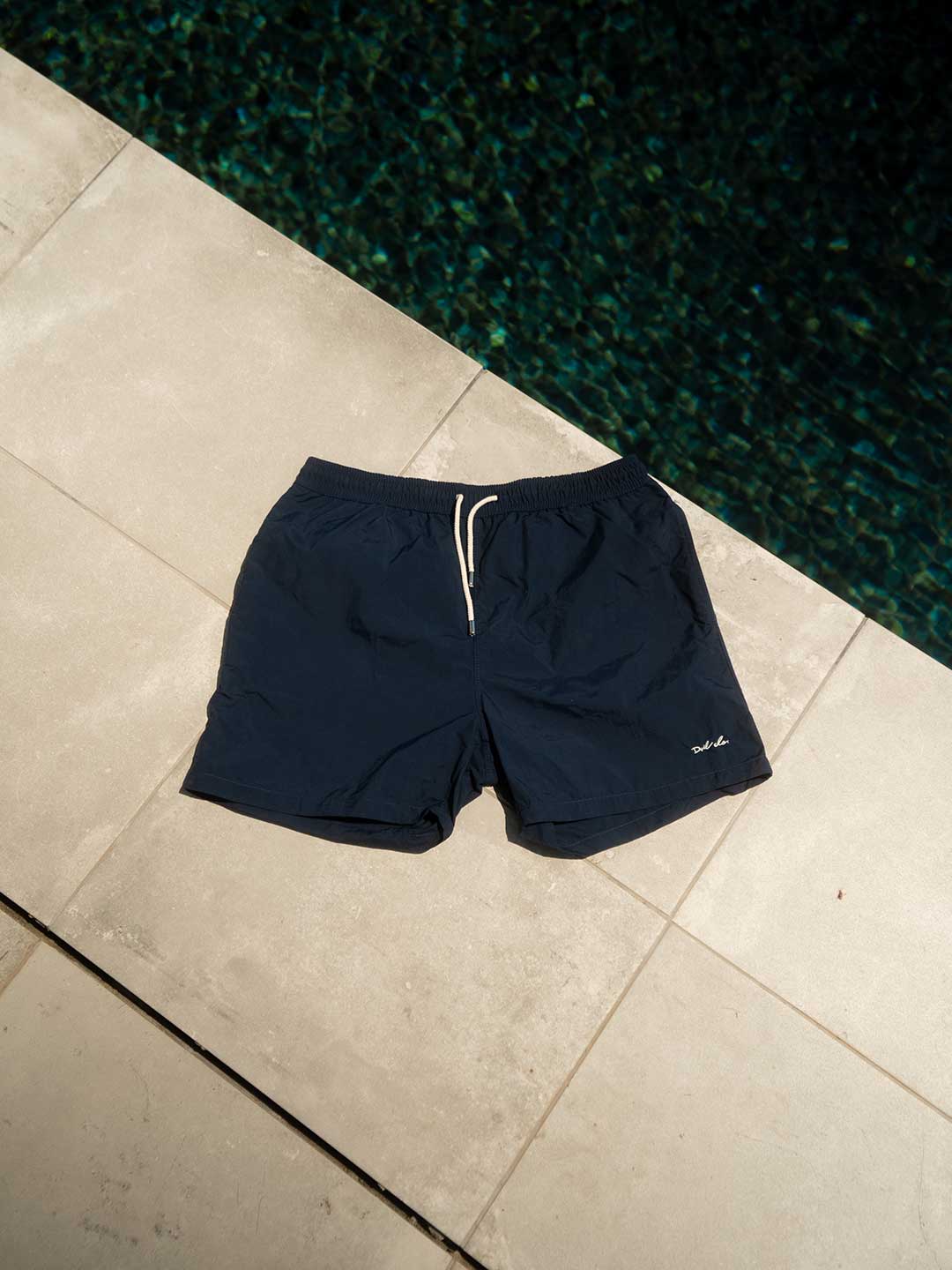 Bañador LLAFRANC de color azul marino que representa el azul del mar y las profundidades,con los cordones blanco crudo y las puntas en cromado. También destacar el DVILclo bordado en blanco crudo.