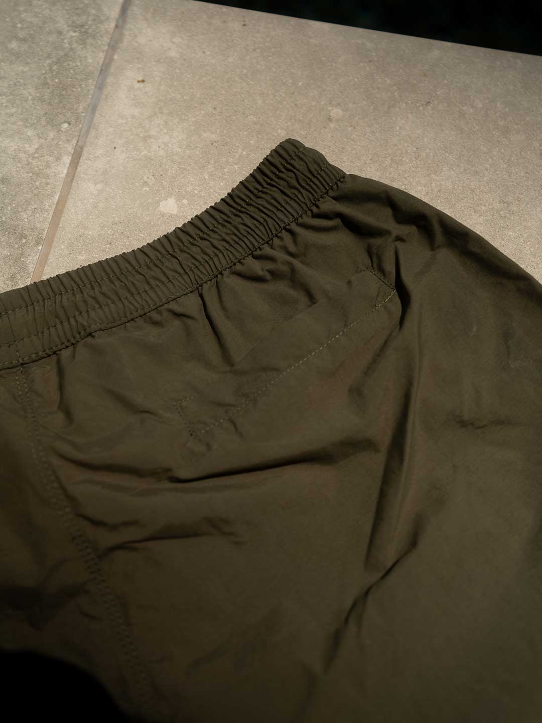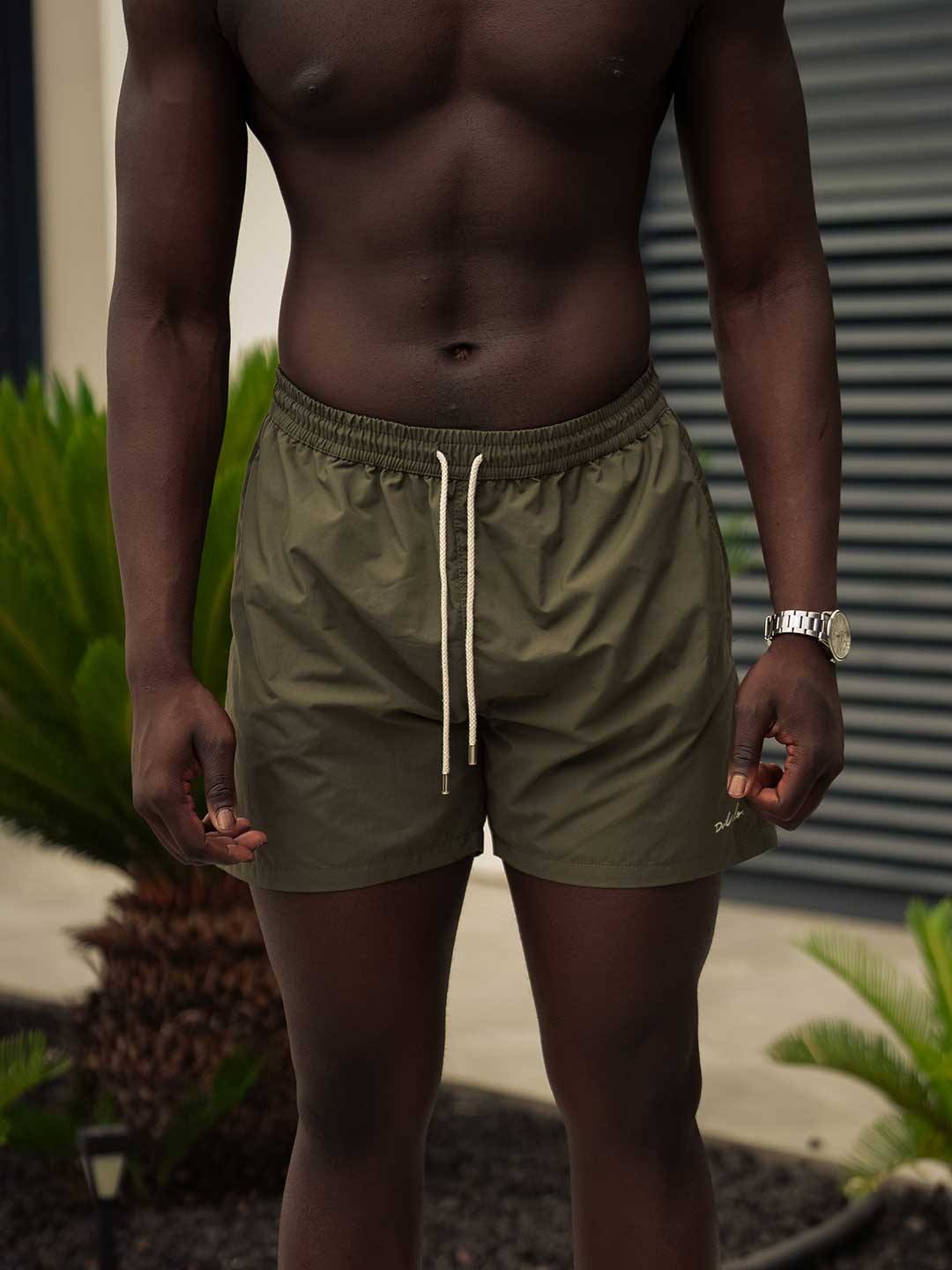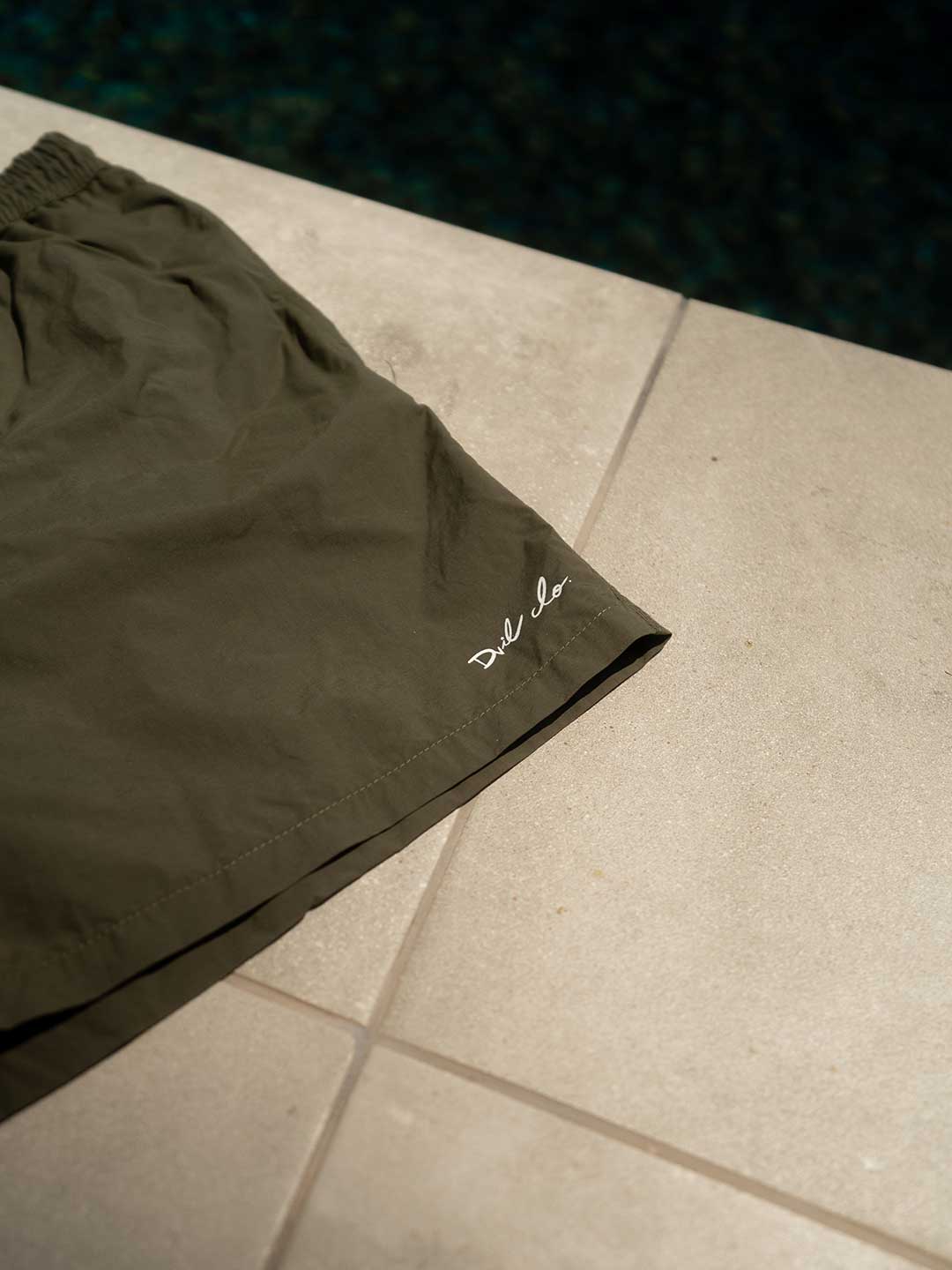 Bañador S’AGARÓ de color verde caqui que representa el verde de los pinos que resaltan en el Camí de Ronda y en pié de la playa. Con los cordones blanco crudo, las puntas en cromado y también detacar el DVILclo bordado en blanco crudo.