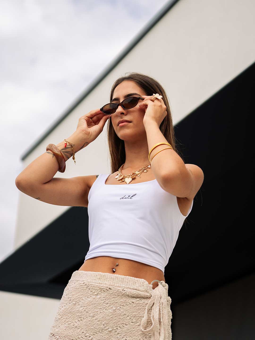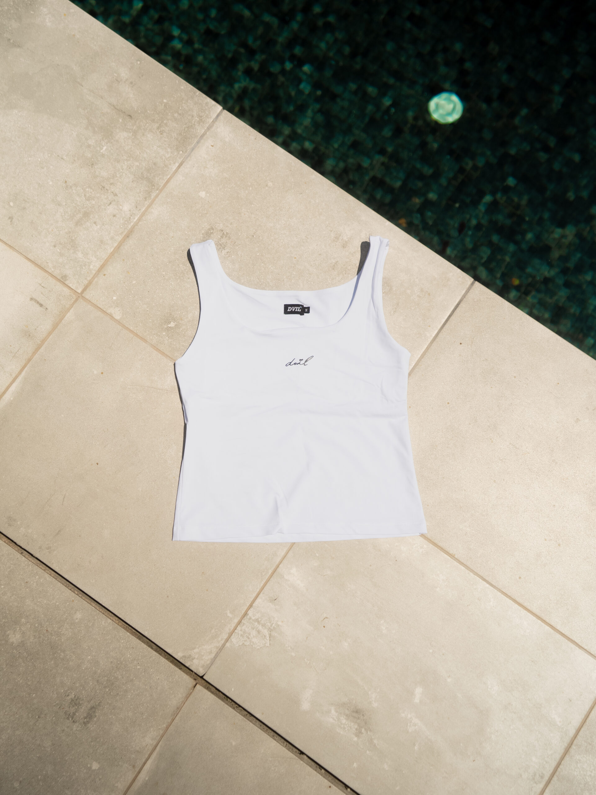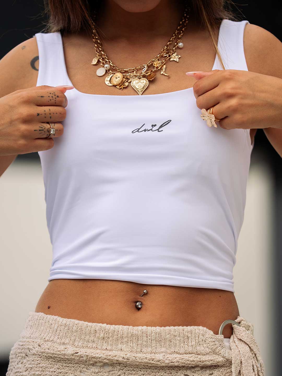 Camiseta top blanca con el detalle DVIL en negro. Cómoda y acogedora.