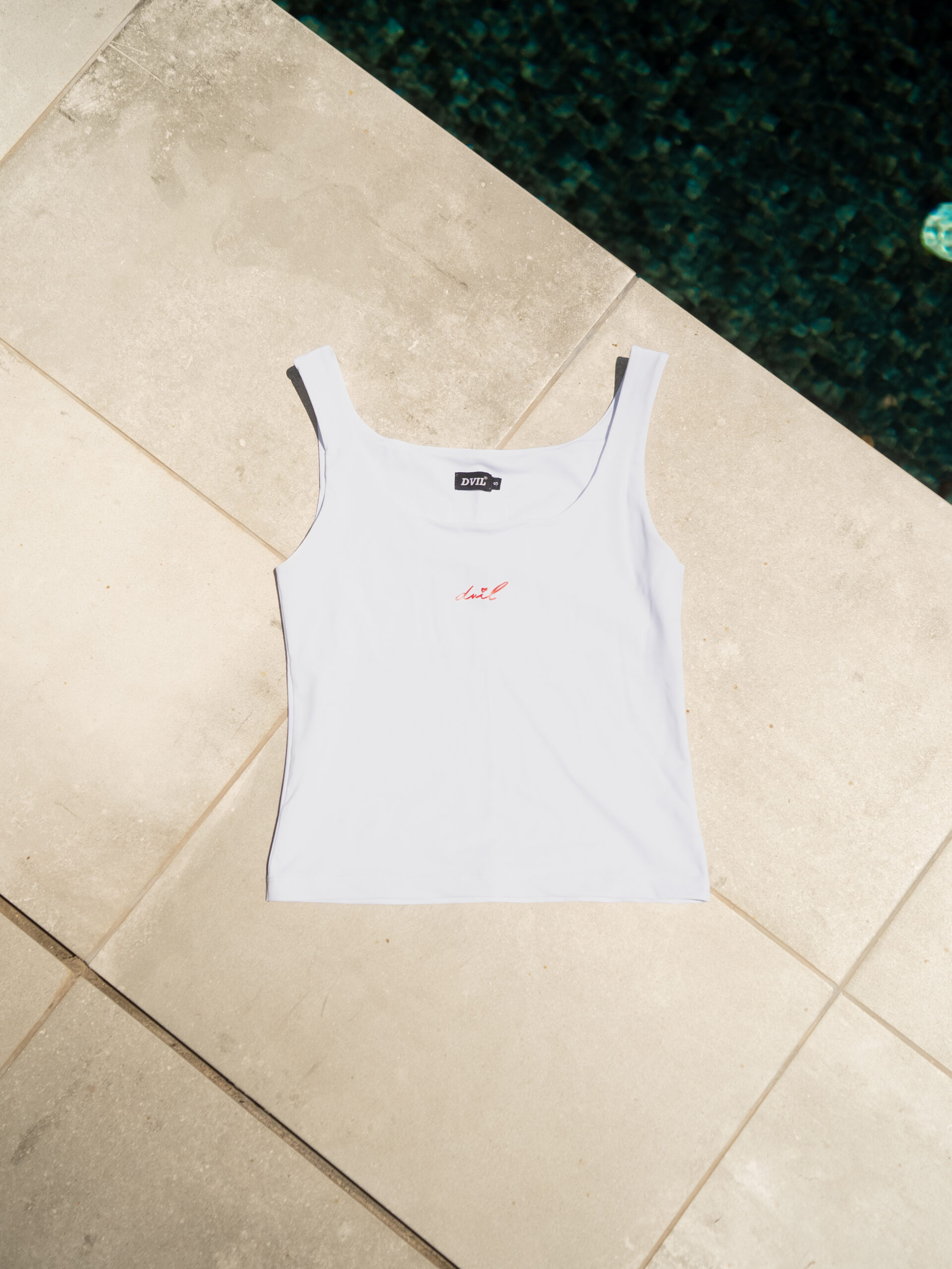 Camiseta top blanca con el detalle DVIL en rojo. Cómoda y acogedora.